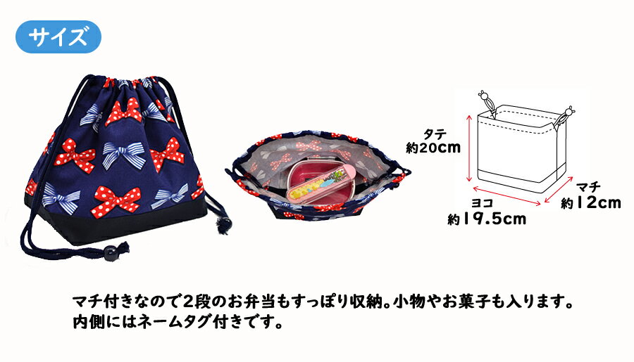 巾着 中 マチ有りお弁当袋(ネームタグ付き) アクアに揺れる大きなリボンコレクション 子供用 中 マチ有りお弁当袋 お弁当 巾着 お弁当袋 キッズ お弁当バッグ ランチ 巾着 ランチ袋 幼稚園 幼児 お弁当 袋 おしゃれ