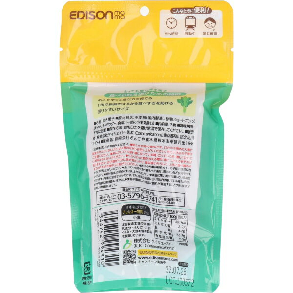 エジソンママ 食べられる歯がため むらさきいも 7枚入エジソンママ 食べられる歯がため とうもろこし 7枚入エジソンママ 食べられる歯がため かぼちゃ 7枚入【エジソンママ 食べられる歯がため ほうれんそう 7枚入】広告文責(有)イースクエアTEL:0120-532-772株式会社ケイジェイシー個装サイズ:110X180X40mm個装重量:約80g内容量:7枚入ケースサイズ:60X31.5X24.5cmケース重量:約6.4kg製造国:日本【発売元:ケイジェイシー】【名称】焼き菓子【原材料】小麦粉(国内製造)、砂糖、ショートニング、ほうれんそうパウダー、食塩、(一部に小麦を含む)【栄養成分(100g当たり)】エネルギー:401kcaLタンパク質:8.2g脂質:3.7g炭水化物:83.7g食塩相当量:0.3g【保存方法】直射日光を避け常温で保存してください。